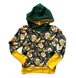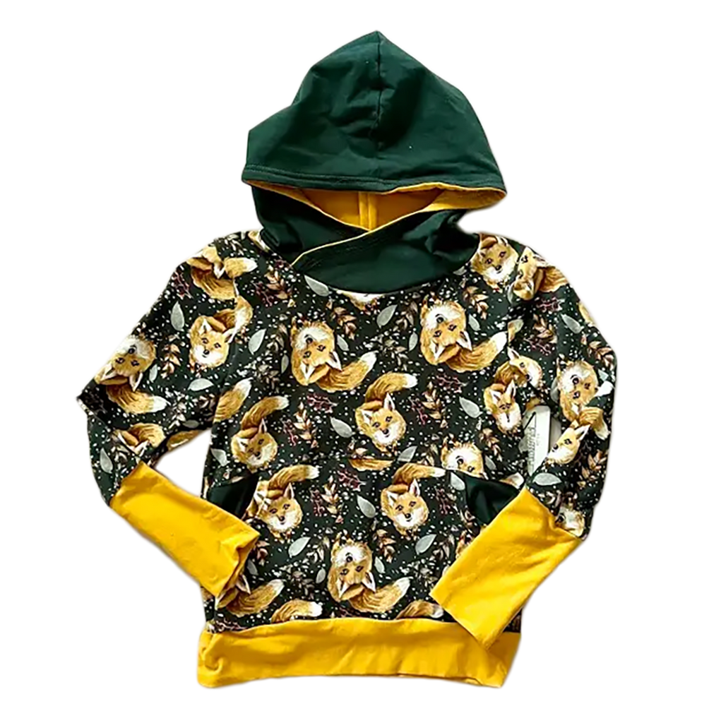 Want to give your kiddo a wild new look? Look no further than the Evergreen Fox! This snuggly hoodie is sure to keep your little one feeling (and looking!) comfy and cozy. Crafted with soft yellow and green fabric, featuring an imaginative fox design - it's perfect for kids who aren't afraid to stand out! Unisex, of course. And fear not, it grows with your child! Get wild!
