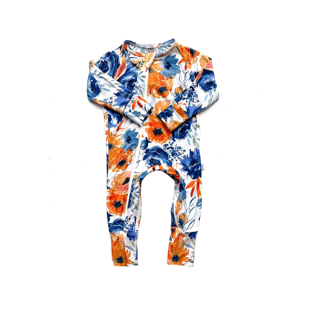 Let your little one bloom in this navy floral bodysuit! Crafted from a durable rayon and spandex blend, it's sure to keep them looking gorgeous in orange and blue floral. With a double zipper for easy diaper changes, it's a bloomin' miracle!