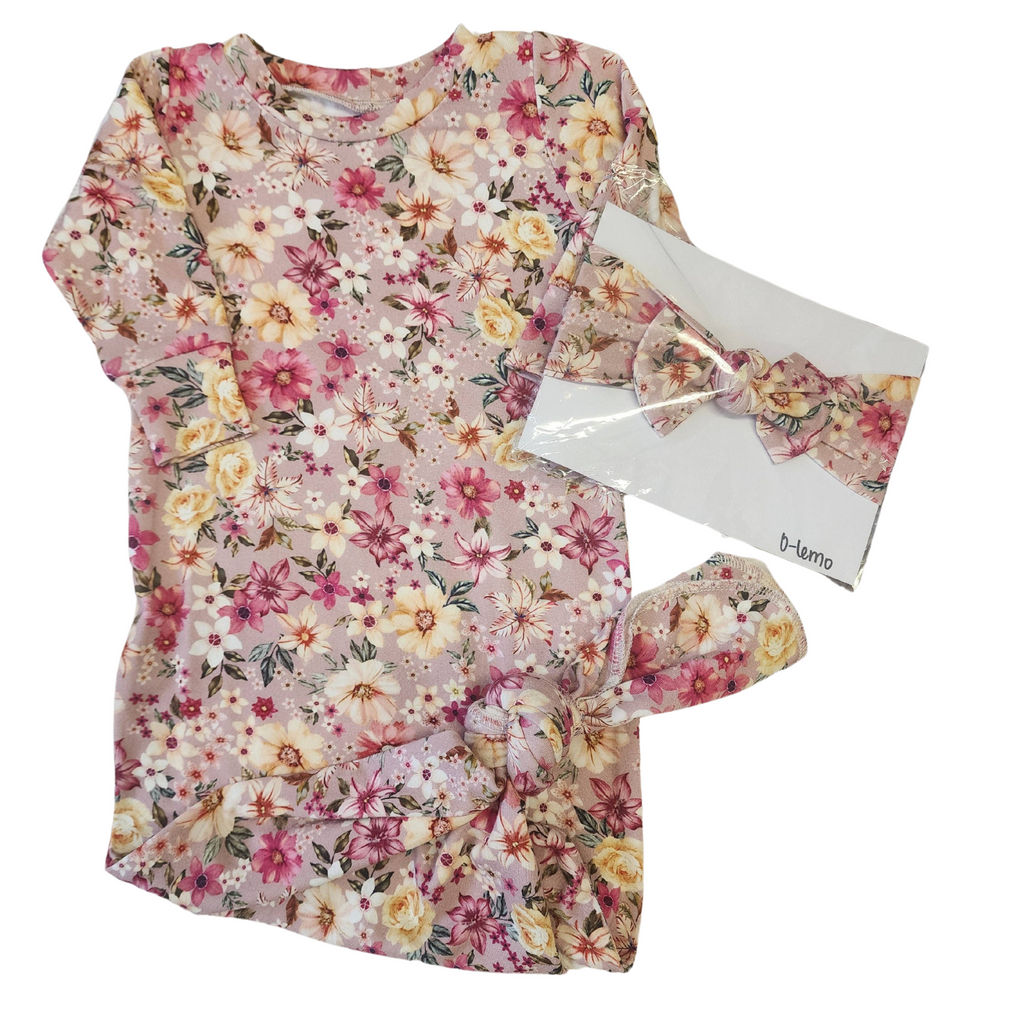 Pink floral gown and bow set. Gown is size 0-3m. Bow is size 0-6m.