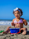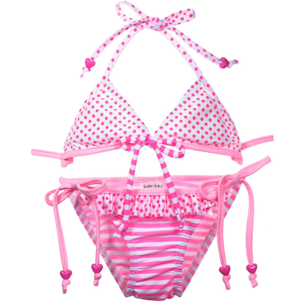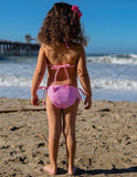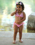 Pinkalicious to the max! Pink dots, pink stripes, pink ruffles, pink ties, pink beads......yeah baby! She might be a girly girl but she has a little attitude to go with! This swimsuit has a fixed triangle top with a bow in the center.
