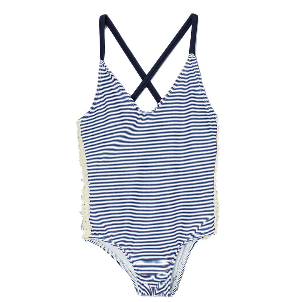 Fashionable girl's one piece with crochet sides and cross back straps.