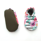 The rubber sole is very soft, yet has enough traction for new walkers. The fact that there's no right or left shoe makes dress time fast and easy.
