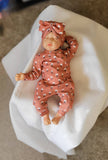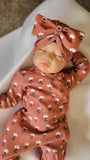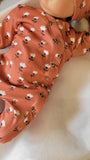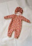 Crafted from soft cotton and spandex, this romper features an asymmetrical snap placket down the side for easy changing. The minimalist rusty red design adorned with dainty daisy-like flowers brings a touch of elegance to everyday wear. Your baby will stay cozy from head to toe with cuffed sleeves and feet. The outfit is complete with a matching turban-style hat with a charming bow.